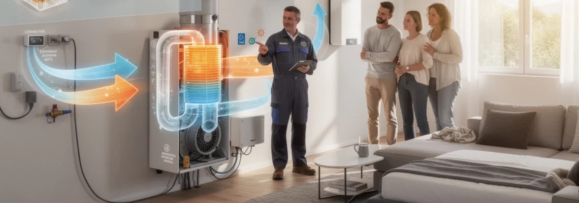 Pour mieux visualiser cet impact, imaginez que chaque mètre cube d’air chaud expulsé par une VMC simple flux emporte avec lui une partie de l’énergie que vous avez payée pour chauffer votre intérieur. La VMC double flux agit comme un « échangeur de monnaie thermique » : avant de laisser sortir cet air, elle en récupère les calories pour les transmettre à l’air neuf. Moins de déperditions par la ventilation signifie moins de travail pour votre chaudière, votre pompe à chaleur ou votre poêle, donc une consommation de gaz, d’électricité ou de granulés réduite.